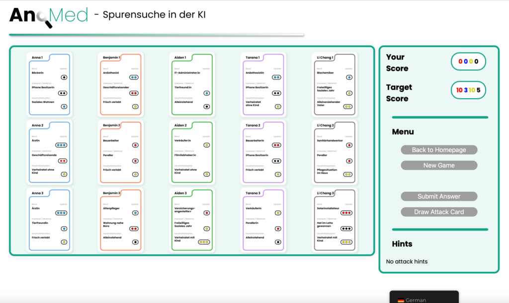 „AnoMed – Spurensuche in der KI“ ist ein innovatives Lern-Brettspiel und vermittelt auf spielerische Weise die Funktionsweise von Künstlicher Intelligenz und sensibilisiert für Datenschutzthemen. Die Spielenden übernehmen die Rolle von Angreifer*innen und versuchen, aus den Ergebnissen eines trainierten Modells private Informationen zu rekonstruieren. Dabei lernen sie, wie KI-Modelle trainiert werden und welche Risiken bei der Nutzung von Daten bestehen. Das Spiel fördert kritisches Denken, Verständnis für KI und Datenschutz sowie die Auseinandersetzung mit ethischen Fragestellungen im digitalen Zeitalter.