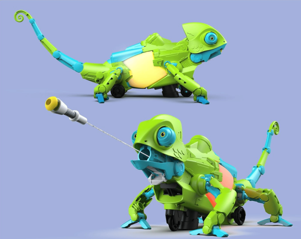 „Carl das Coding Chamäleon“ist ein echter Bringer. Die Bauphase ist ein wichtiger Teil und wie immer nicht ganz ohne. Schön knifflig teilweise, aber auch superspannend und lehrreich – mit Getriebe, Motoren und Sensoren. Wer alles geschickt zusammenbastelt, kann darauf stolz sein. Auch der fertige Carl bietet langen Spielspaß. Er reagiert auf seine Umgebung, bewegt sich und kann herumlaufen. Teile seines Körpers leuchten. Manchmal öffnet er sein Maul und schießt seine Zunge heraus. Deutlich agiler und dynamischer als andere Robo-Pets im Feld. Eigene Abfolgen der verfügbaren Moves kann man ihm ganz einfach einprogrammieren: über farbige Karten, die man ihm unter den Bauch hält. Wirklich gelungen, wirklich cool.