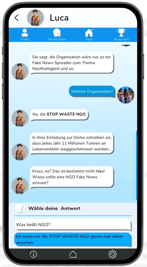 Verbreitung von Fake News und Verschwörungserzählungen auseinandersetzen. Die Oberfläche erinnert an authentische Kommunikationssituationen, sodass die Jugendlichen ähnliche Strukturen in ihrer Lebenswelt leichter erkennen können. Das von der evangelischen Kirche und Playing History umgesetzte Konzept setzt dabei auf einen zweiteiligen Workshop, wobei im ersten Teil das Spiel gespielt wird und im zweiten Teil dann durch pädagogisches Fachpersonal das Erlebte reflektiert und auf die Lebenswelt übertragen wird.