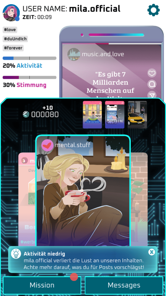 Im kostenlosen Mobile Game „The Feed“ schlüpfen die Spieler*innen in die Rolle von Praktikant*innen eines großen Social-Media-Unternehmens. Ihre Aufgabe: Die Nutzer*innen so lange wie möglich online zu halten, indem sie selbst zum Algorithmus werden. Dafür treffen sie gezielte Entscheidungen darüber, welche Inhalte den UserInnen angezeigt werden sollen, während sie gleichzeitig immer mehr Informationen über deren Vorlieben und Interessen sammeln und dabei für die Funktionsweise von Social-Media-Plattformen sensibilisiert werden. Aufschlussreich.